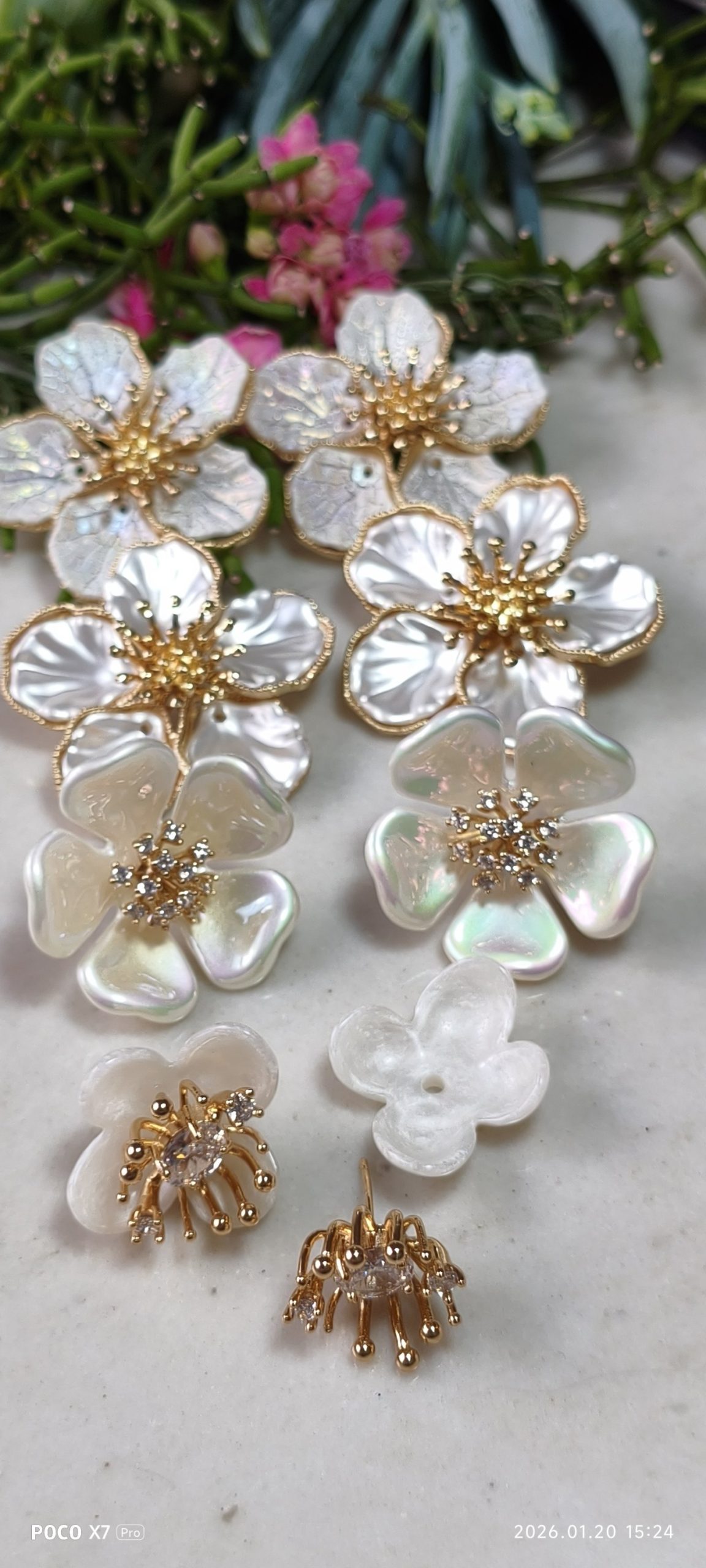 Brincos elegantes e delicados em resina branca perolada, com acabamento em ouro 18 K
