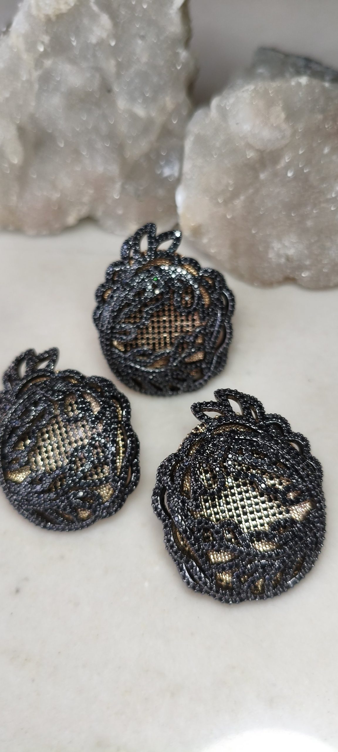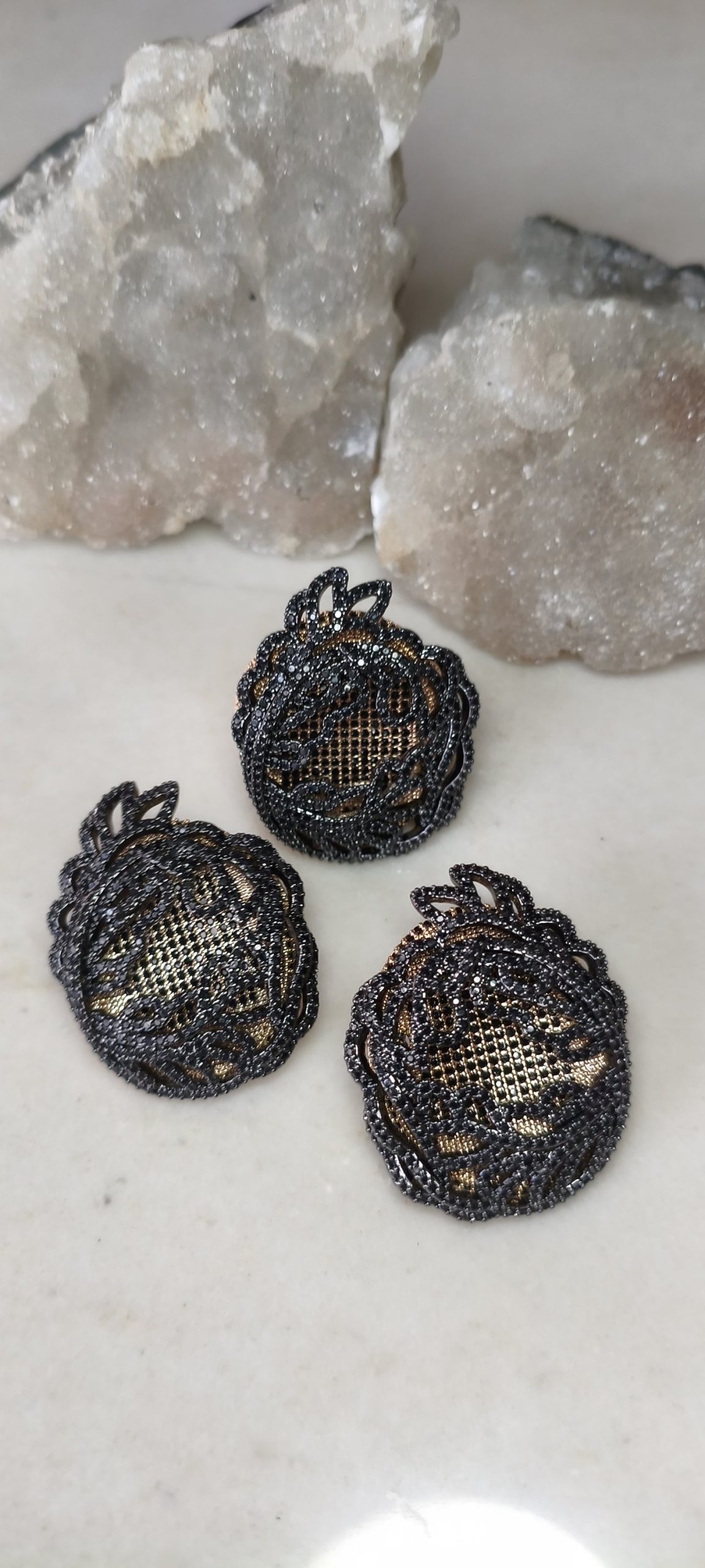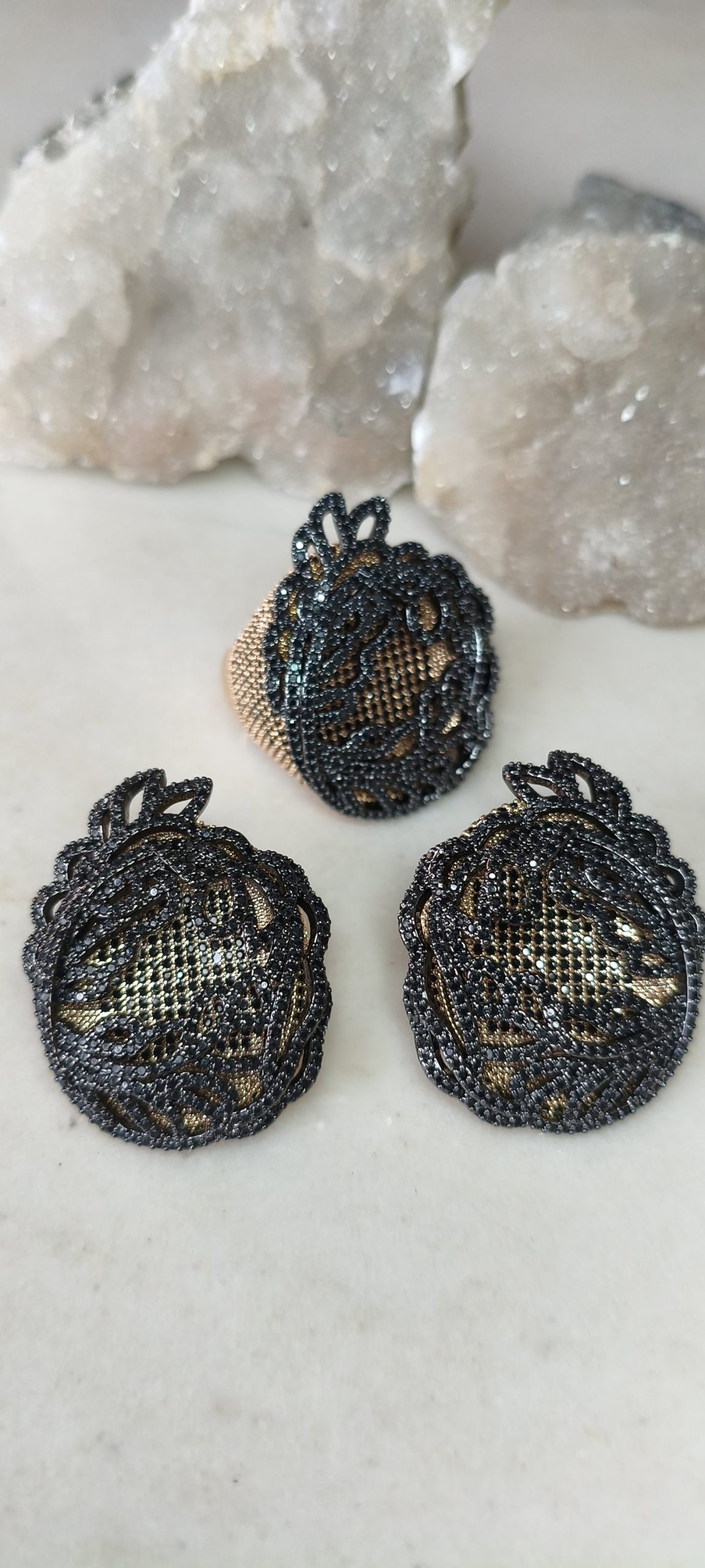 Conjunto anel e brincos em flor negra, cravejado com microsircônias negras, banho 18k.