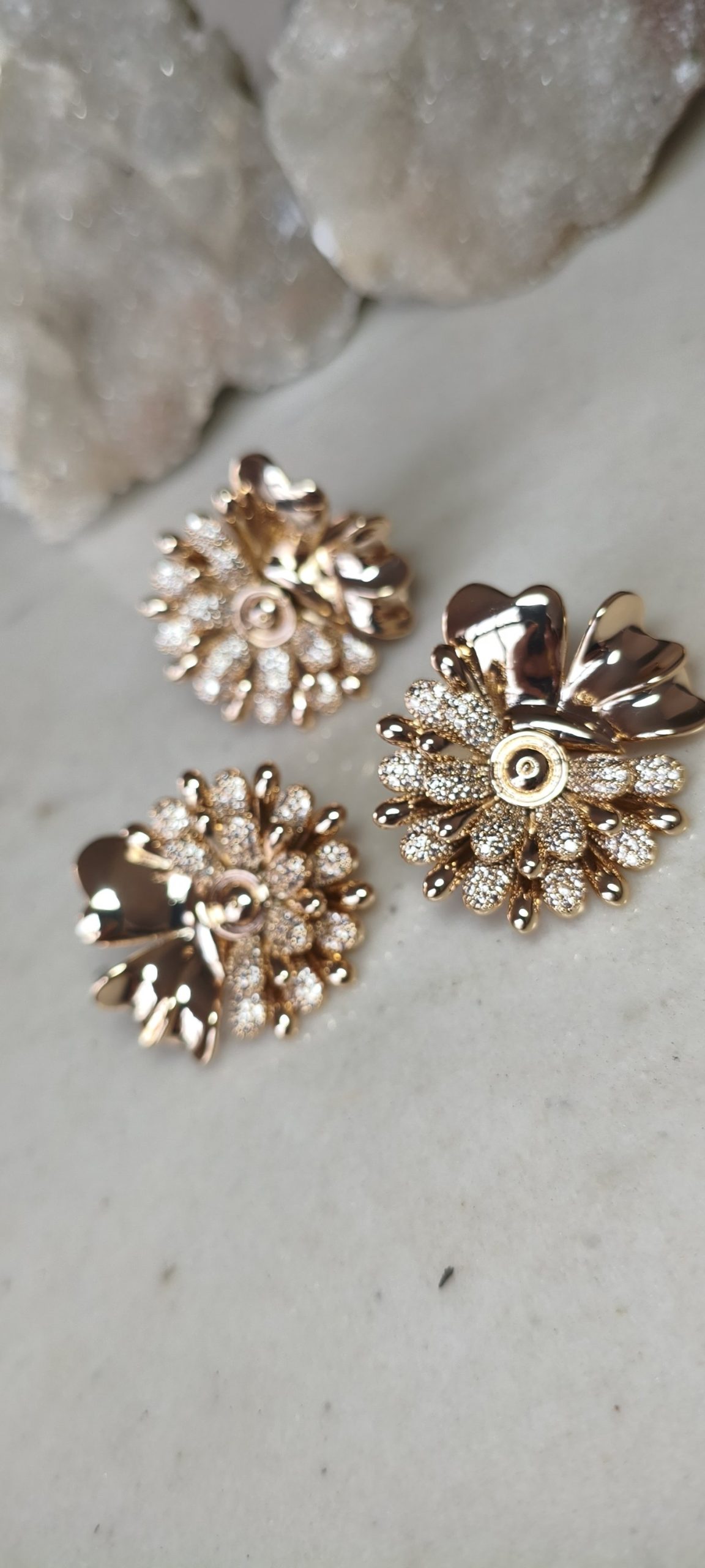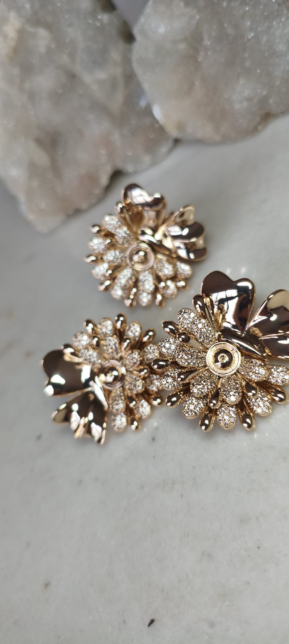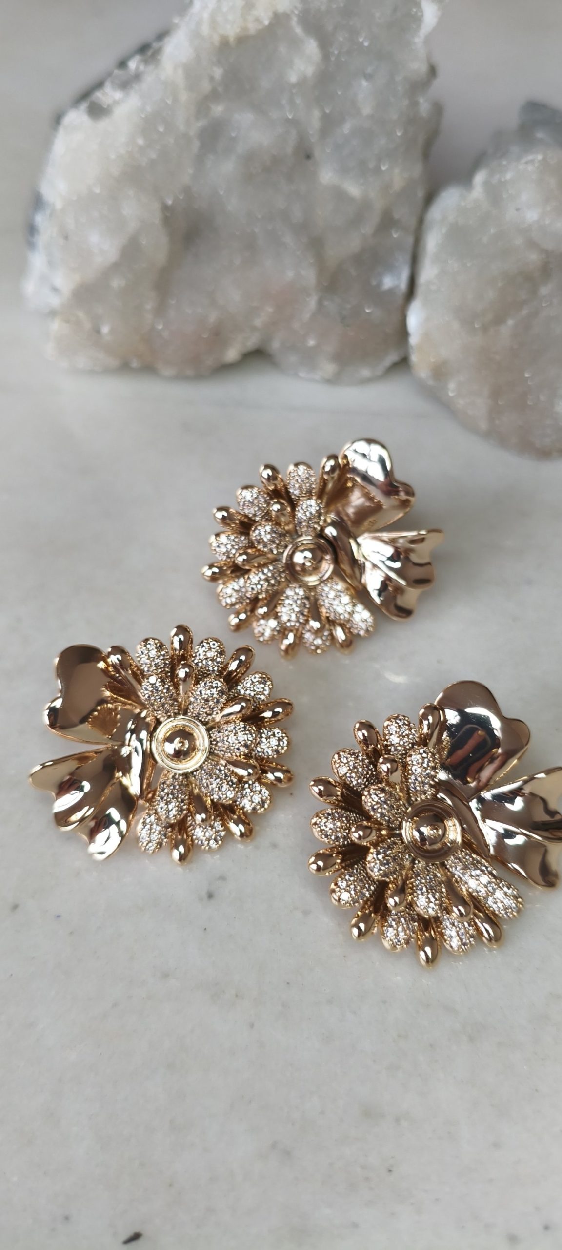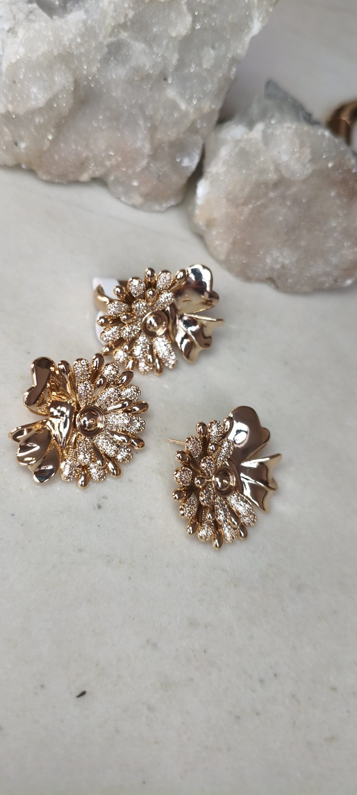 Conjunto de flor em ouro 18k, banhado a ouro, com microcravação em zircônias. Anel do tamanho 19, disponível apenas para venda no varejo. Você pode conferir o catálogo acessando nosso perfil no Instagram.